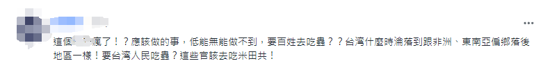“民进党当局吃预算,却叫匹夫吃虫。”不少台网友盛怒暗示“要疯了”,民进党当局计谋无脑又害东说念主,“在窝囊绿营在野下,台湾匹夫越来越像原始东说念主”。